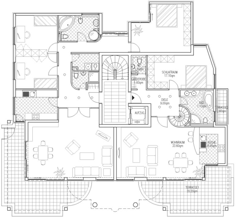 sich ein Geschoss tiefer, so daß die, mit dem Aufzuf schwellenfrei